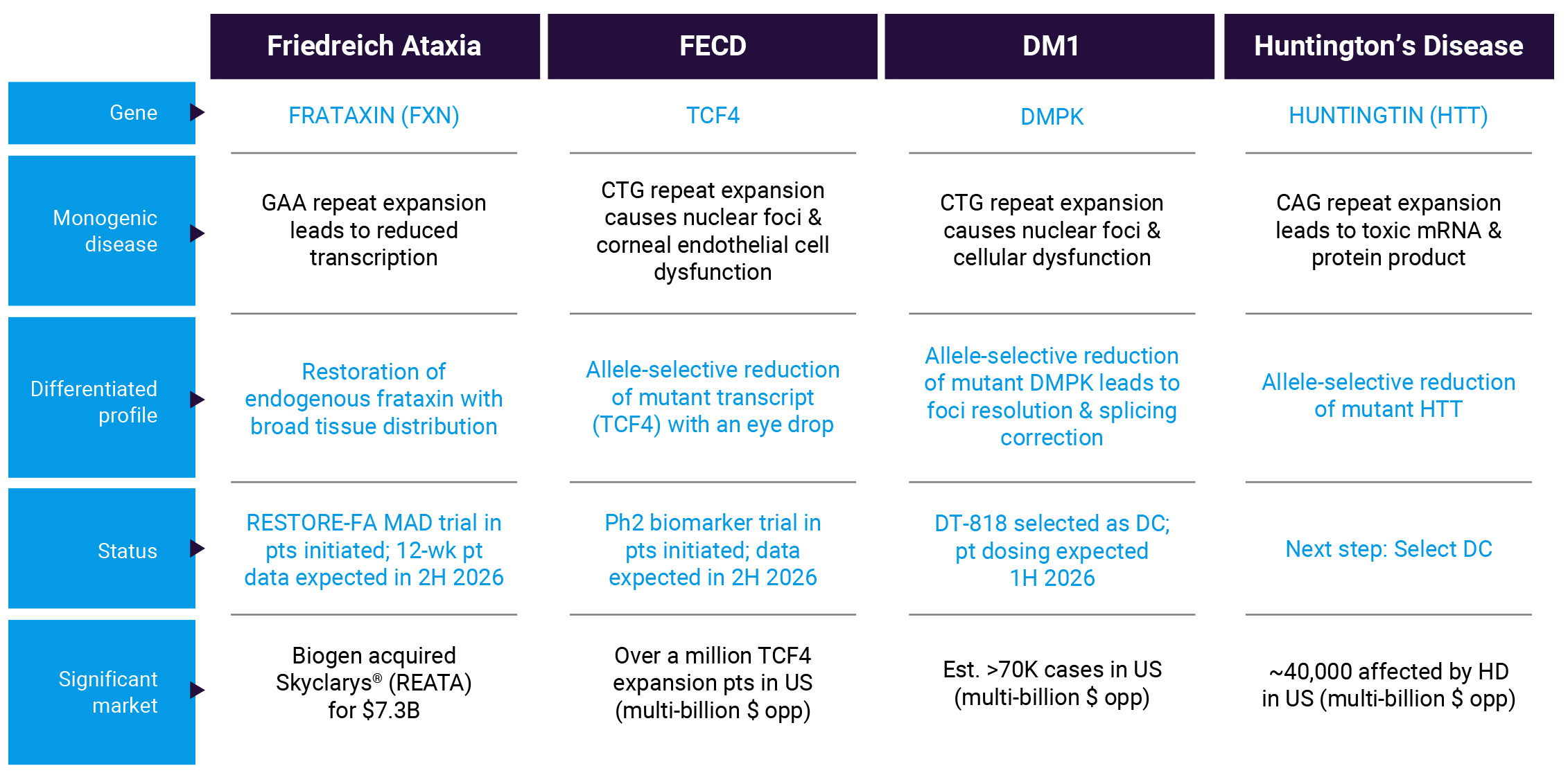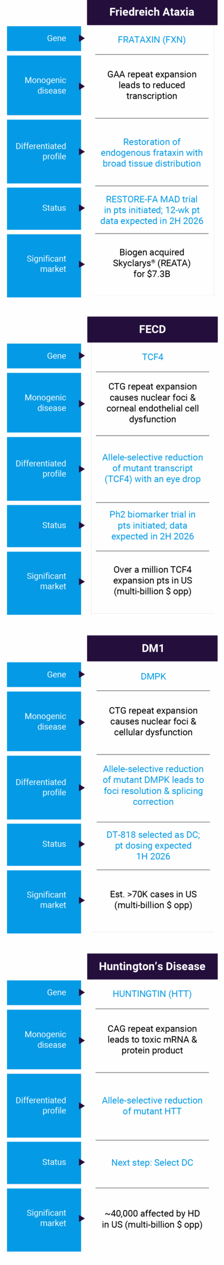 In 2025, we opened a Phase 1/2 multiple dose trial of DT-216P2 known as RESTORE-FA (Reactivating Expression Suppressed Through Overcoming Repeat Expansion for FA). The RESTORE-FA trial is designed to evaluate the safety, tolerability, pharmacokinetics (PK), and pharmacodynamics (PD) of IV and subcutaneous administration of DT-216P2 in patients with FA.